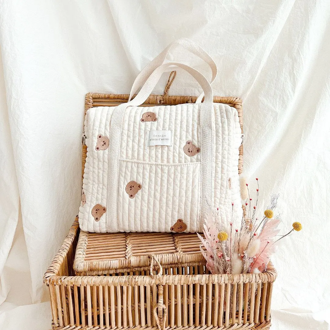 Bolso maternal c/bordadoMaterial: AlgodónMedidas 36 x 12 x 30 cm