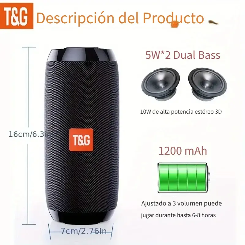 Modelo: Tg117Versión: Bluetooth Versión 5.0Batería 1200MahMedidas: 7Cm C 17CmIncluye Cable Usb Y Cable De Audio