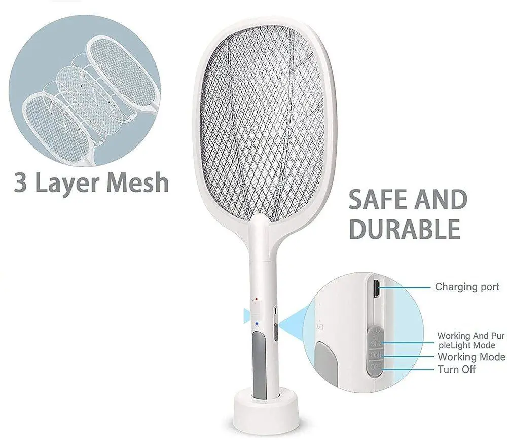 Una raqueta eléctrica que mata moscas, mosquitos y otros insectos fácilmente, basta con un solo movimiento.