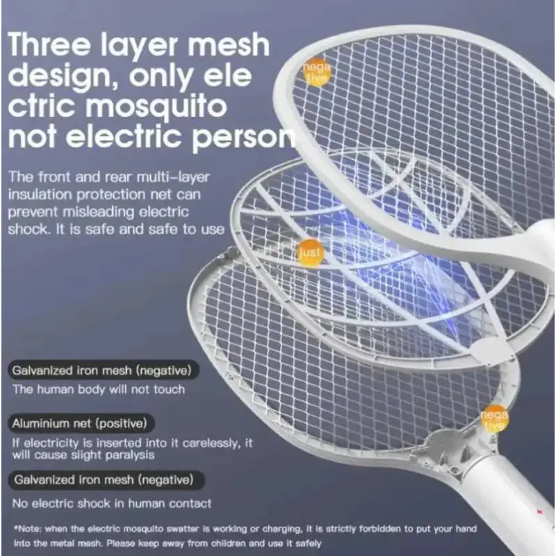 Los insectos caerán fulminados al darles un raquetazo y tocar la rejilla interna eléctrica o al golpearse contra las rejillas externas de protección, gracias a su diseño de triple capa y máxima seguridad.